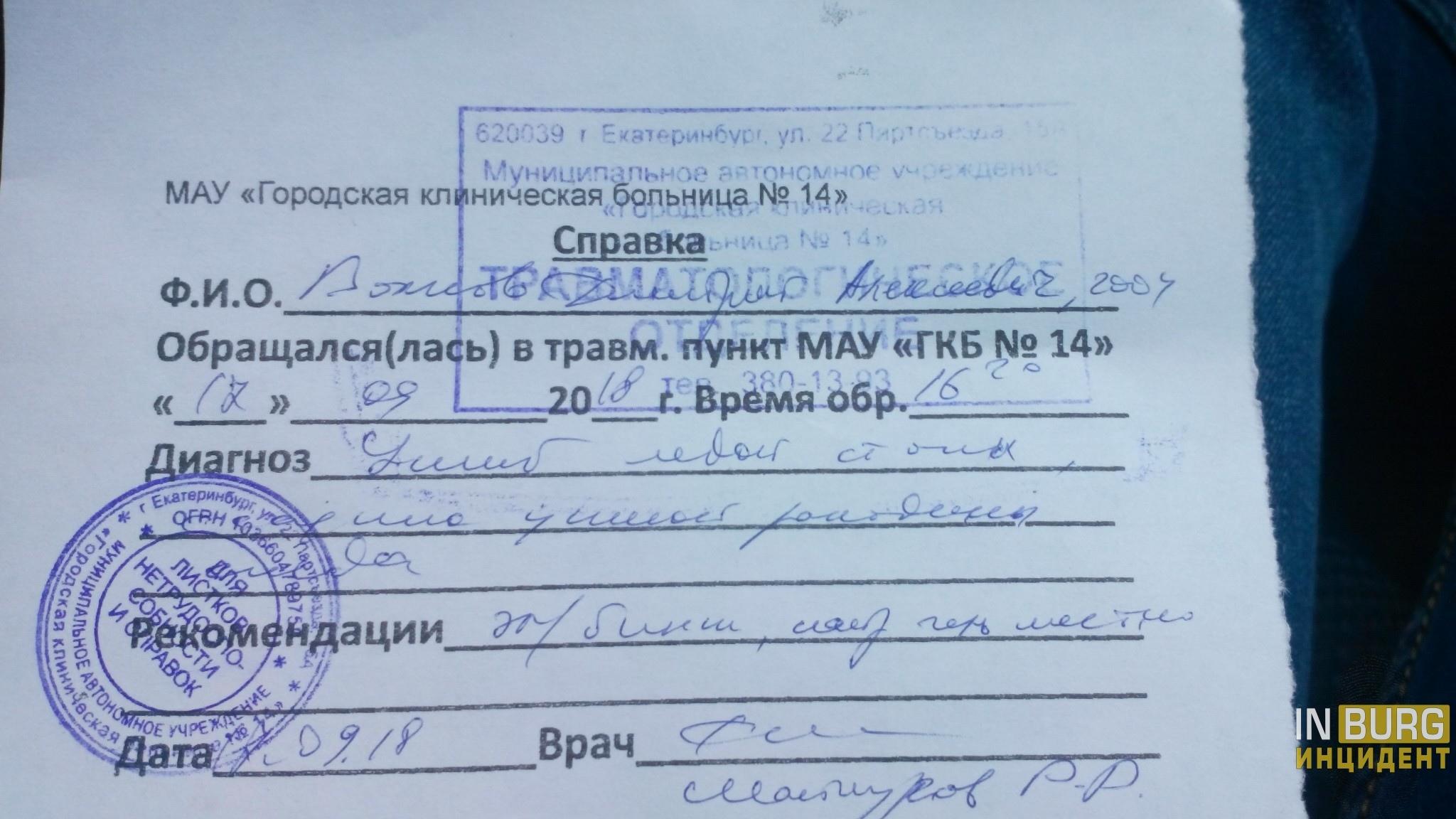 В больнице №14 подростку поставили диагноз «ушиб левой стопы» и «ссадина ушной раковины». Рекомендации — эластичный бинт и «Найз гель» местно.