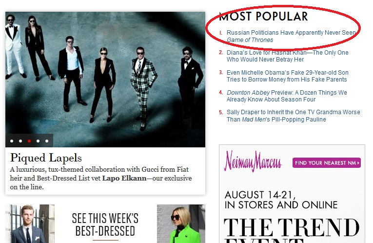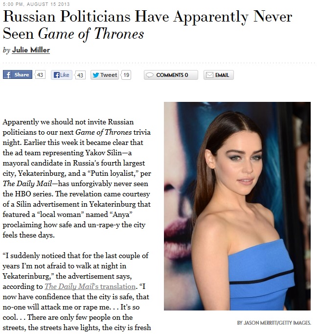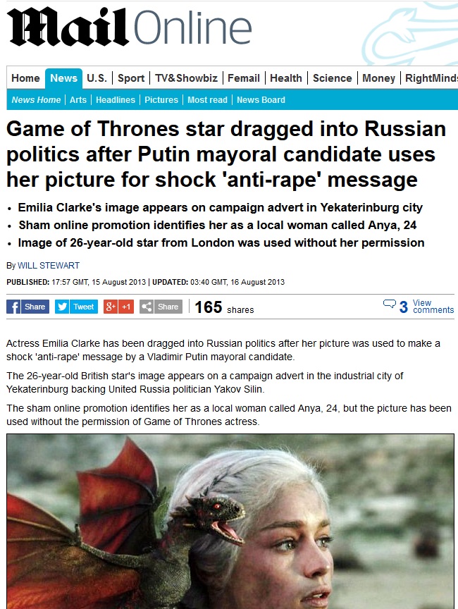 Однако сегодня утром новость об использовании фотографии Эмилии Кларк в политической рекламе написали британская газета «Daily Mail» и американская «Vanity Fair». Причем у американцев новость с заголовком «Российские политики, очевидно, никогда не видели «Игру престолов» стала самой популярной среди читателей.