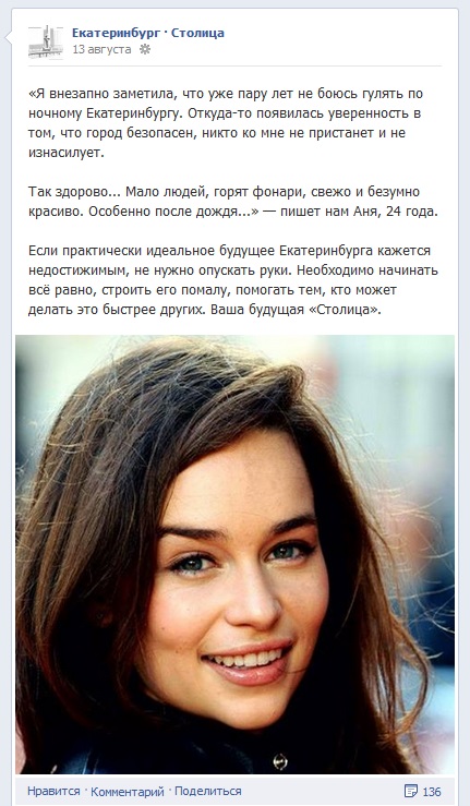 «Наш пост-фантазия с фотографией Эмилии Кларк, многим хорошо знакомой по сериалу «Игра престолов», вызвал странный резонанс. Господа, уверяем вас, Дайнерис Таргариен (героиня Эмилии в сериале — прим. ред.) в данном случае просто красивая женщина. На ее поддержку мы не претендуем, хотя ей однозначно не будет стыдно показать Екатеринбург после реализации программы «Столица». Также мы будем рады видеть дом Старков, речных лордов и Тириона Ланнистера лично»,— отшутились пиарщики.