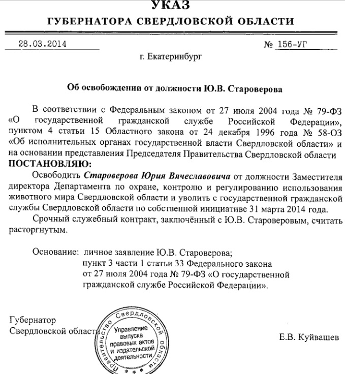 Губернатор Свердловской области Евгений Куйвашев подписал указ об освобождении от должности заместителя директора департамента по охране, контролю и регулированию использования животного мира региона Юрия Староверова.