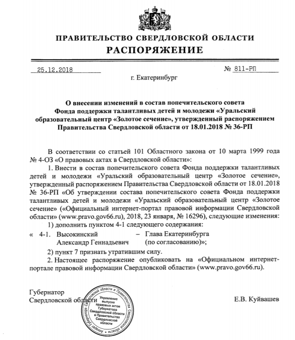 Глава Екатеринбурга Александр Высокинский включен в состав попечительского совета Фонда поддержки талантливых детей и молодежи «Золотое сечение». Соответствующий документ за подписью губернатора опубликован на портале правовой информации.