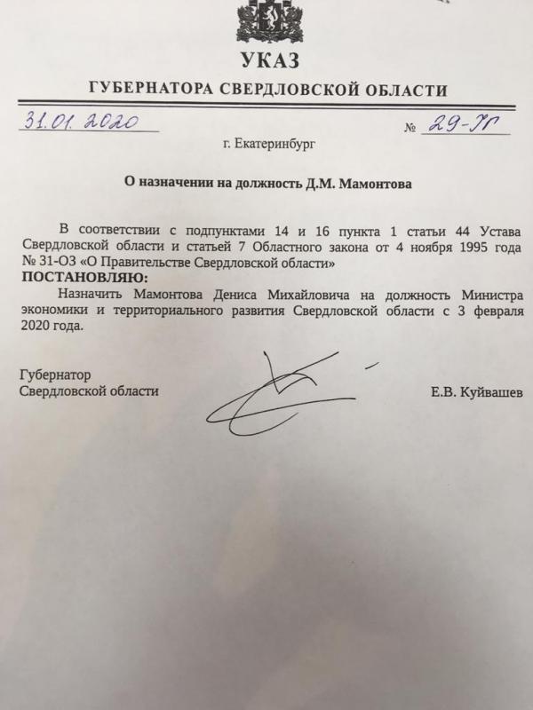 Бывший вице-мэр Мегиона Денис Мамонтов перешел на работу в Свердловскую область. Он получил должность регионального министра экономики, пустовавшую год. Соответствующий указ подписал губернатор Свердловской области Евгений Куйвашев.