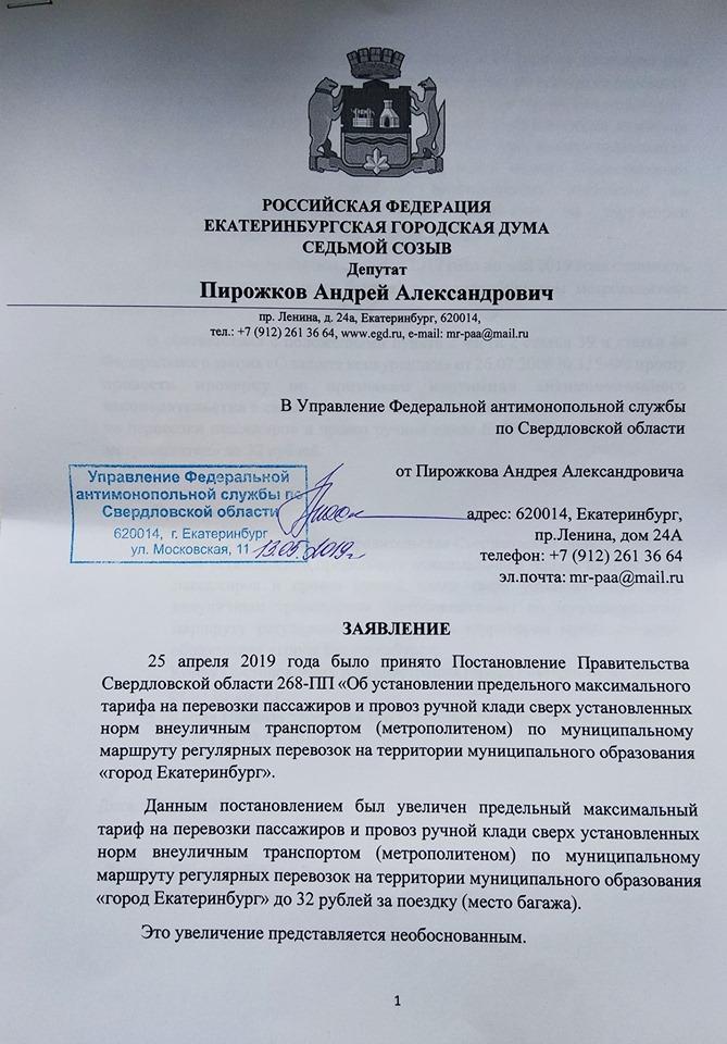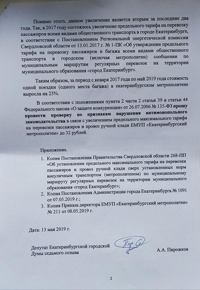 «Прошу провести проверку по признакам нарушения антимонопольного законодательства в связи с увеличением предельного максимального тарифа на перевозки пассажиров и провоза ручной клади ЕМУП «Екатеринбургский метрополитен» до 32 рублей», – говорится в документе.