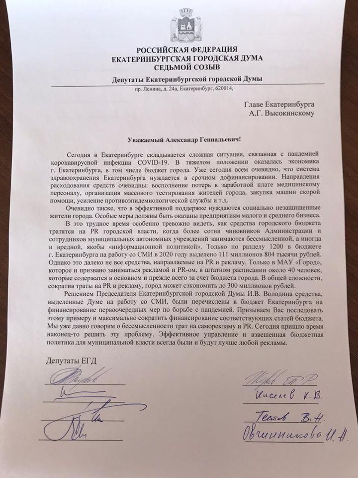 «В это трудное время особенно тревожно видеть, как средства городского бюджета тратятся на пиар городской власти, когда более сотни чиновников администрации и сотрудников муниципальных автономных учреждений занимаются бессмысленной, а иногда и вредной якобы «информационной политикой». Только по разделу 1200 в бюджете Екатеринбурга на работу со СМИ в 2020 году выделено 111 млн 804 тысяч рублей. Однако это далеко не все средства, направляемые на PR и рекламу. Только в МАУ «Город» в штатном расписании около 40 человек, которые содержатся в основном и прежде всего за бюджет города», – говорится в официальном письме.