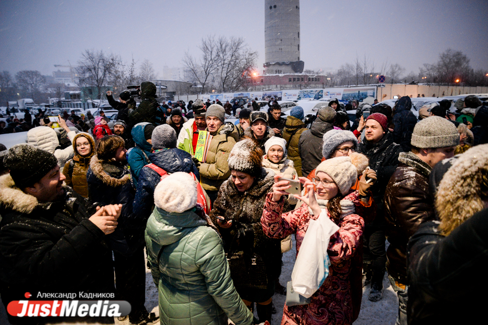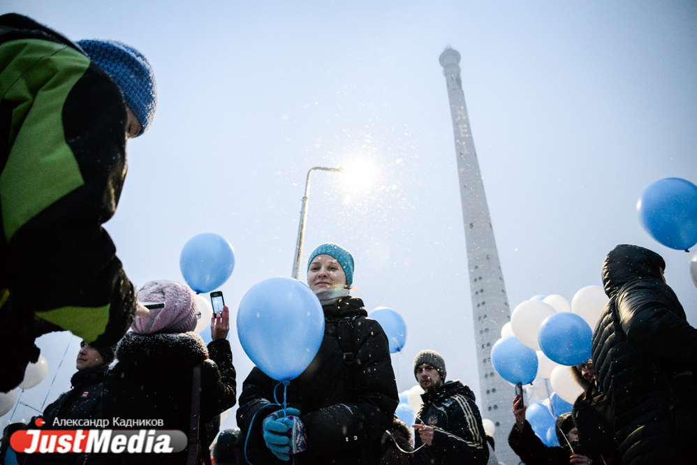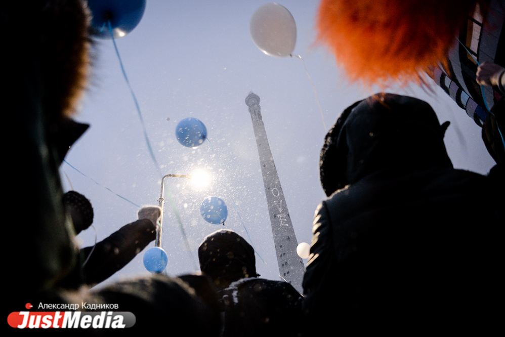 Несколько сотен жителей Екатеринбурга пришли сегодня к подножию недостроенной телебашни, чтобы попытаться остановить ее снос, запланированный на субботу, 24 марта. Они попытались обнять культовый недострой и запустили в небо голубые и белые воздушные шары.