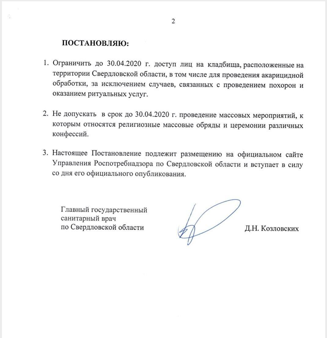 Своим постановлением в рамках борьбы с COVID-19 глава регионального Роспотребнадзора запрещает «в срок до 30.04.2020 проведение массовых мероприятий, к которым относятся религиозные массовые обряды и церемонии различных конфессий». В документе сказано, что этот момент согласован с патриархом Всея Руси Кириллом. Одновременно с этим так же до 30 апреля запрещен вход на кладбища, за исключением похорон. Это связано с акарицидной обработкой территорий.