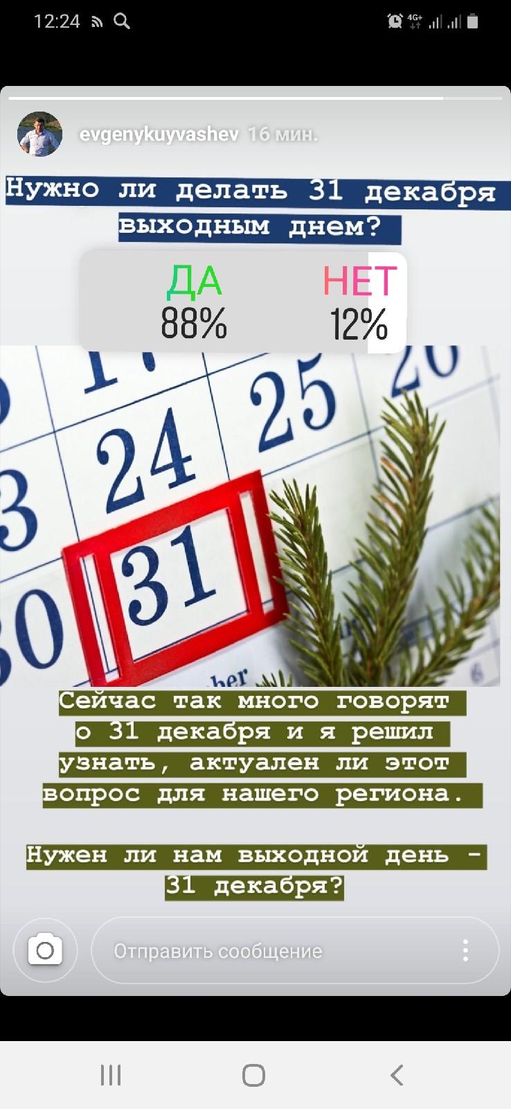За то, чтобы сделать последний день года выходным на данный момент высказалось 88 % подписчиков главы региона. Исходя из результата аналогичных голосований 31 декабря сделали выходным днем в Крыму, Томской и Кировской областях, но и на Ставрополье и в Псковской области.