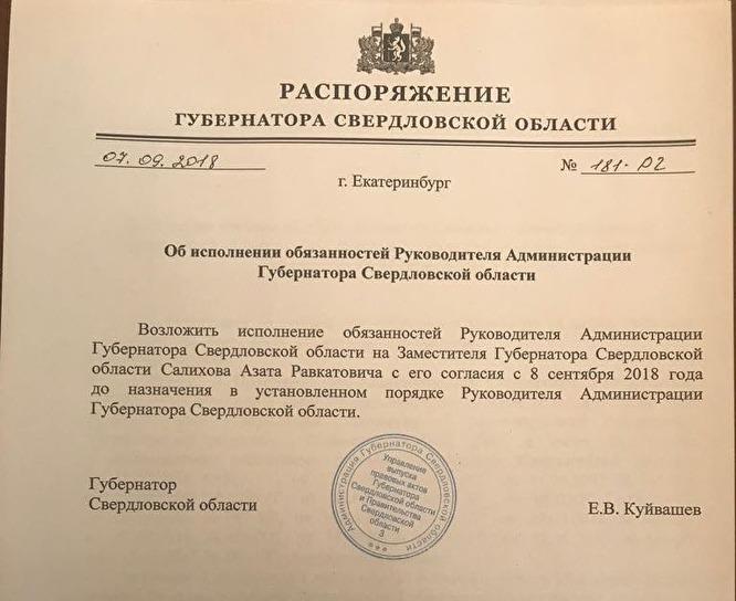 Евгений Куйвашев подписал Указ об освобождении от должности первого вице-губернатора, руководителя администрации губернатора Владимира Тунгусова. Этим же документом ликвидирован дублирующий пост первого вице-губернатора. Администрацию главы региона возглавил первый вице-губернатор, руководитель аппарата правительства Азат Салихов.