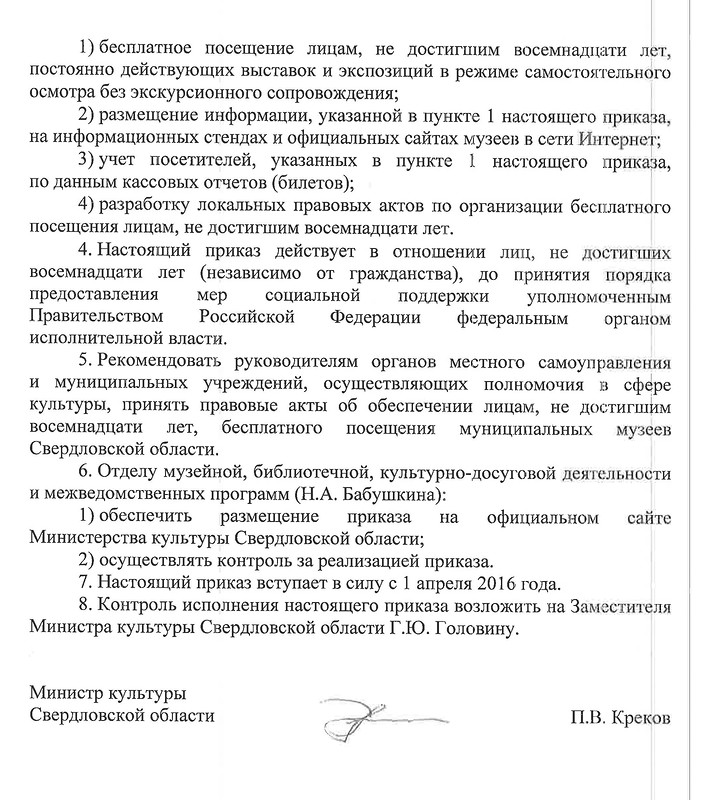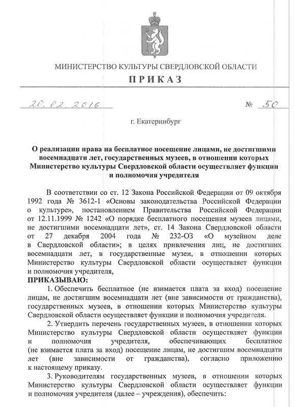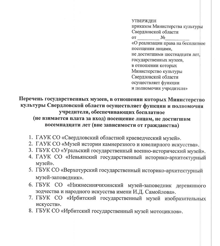 С 1 апреля несовершенные жители Свердловской области смогут бесплатно посещать музеи. Такой приказ в конце февраля подписал министр культуры области Павел Креков, сообщил депутат Заксо Андрей Альшевских. По словам народного избранника, в список музеев, которые будут бесплатными, вошли краеведческий музей, музей камнерезного и ювелирного искусства, военно-исторический музей, невьянский историко-архитектурный музей, верхотурский историко-архитектурный музей-заповедник, нижнесинячихинский музей-заповедник деревянного зодчества и народного искусства, ирбитский музей изобразительных искусств и ирбитский музей мотоциклов.
