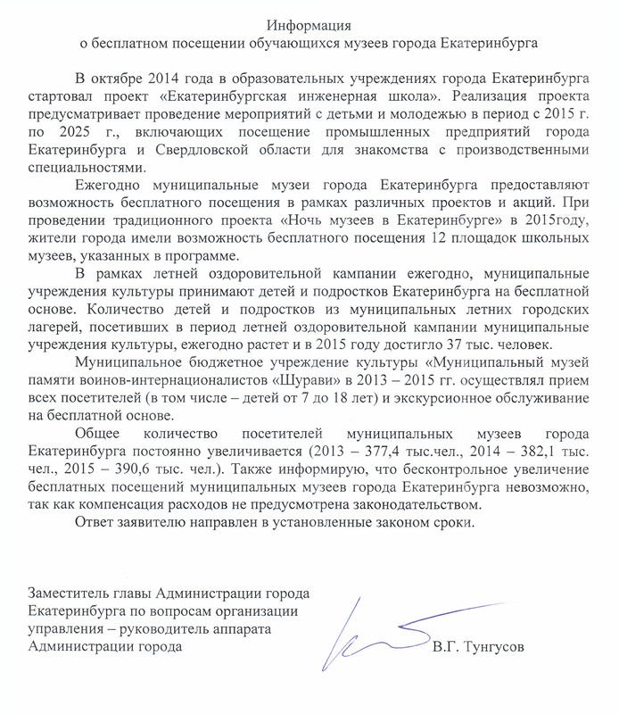 В частности, заместитель главы администрации Екатеринбурга по вопросам организации управления Владимир Тунгусов отметил, что «бесконтрольное увеличение бесплатных посещений муниципальных музеев города Екатеринбурга невозможно».