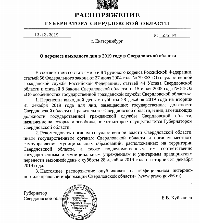 «Перенести выходной день с субботы 28 декабря 2019 года на вторник 31 декабря 2019 года для лиц, замещающих государственные должности Свердловской области в правительстве Свердловской области, и лиц, замещающих должности государственной гражданской службы Свердловской области, назначение на которые и освобождение от которых осуществляется губернатором Свердловской области», – говорится в официальном документе.