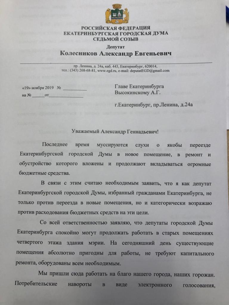 В думе Екатеринбурга продолжают активно обсуждать грядущий переезд в новые помещения. На сегодняшнем заседании депутат Александр Колесников выступил против этого и уже подготовил обращение на имя мэра Александра Высокинского.