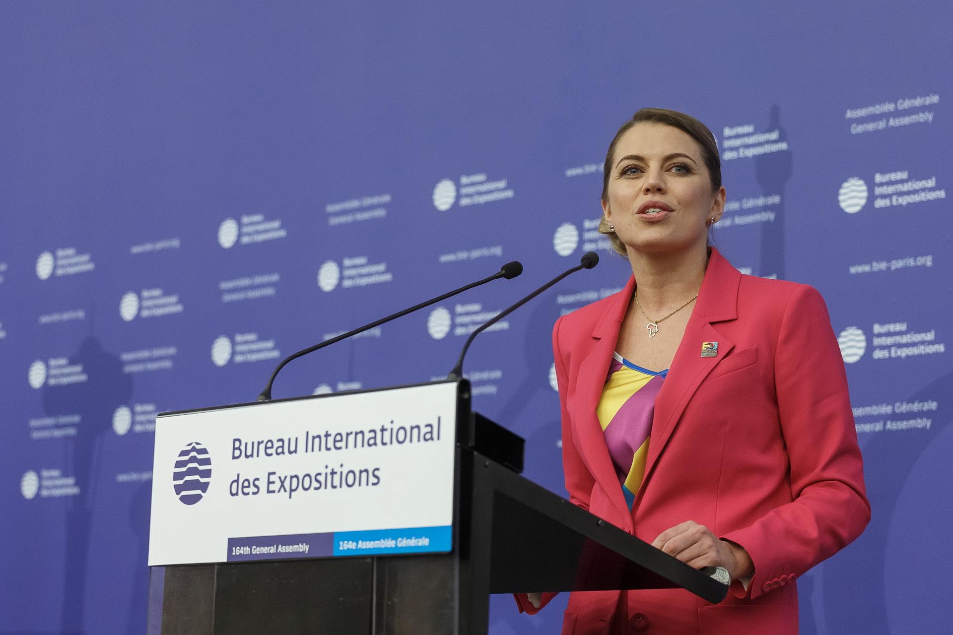 Российская делегация презентовала заявку Екатеринбурга на право проведения Всемирной выставки ЭКСПО-2025 в рамках 164-й Генеральной ассамблеи Международного бюро выставок. Перед национальными делегатами МБВ выступили министр промышленности и торговли РФ Денис Мантуров, генеральный директор оргкомитета «Россия-2018» Алексей Сорокин, прославленная оперная певица Аида Гарифуллина, генеральный директор заявочного комитета ЭКСПО-2025 Александр Чернов.