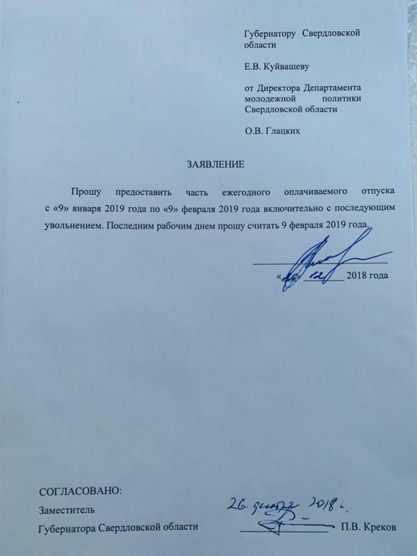 Скандально известная чиновница Ольга Глацких ушла в отставку с поста директора департамента молодежной политики. Об этом она сообщила екатеринбургскому активисту Сергею Колясникову, который опубликовал скан ее заявления в своем блоге. В сообщении, приложенном к официальной бумаге, согласно которой Глацких пробудет в ежегодном оплачиваемом отпуске до 9 февраля, а затем покинет правительство региона, она объяснила свое решение.