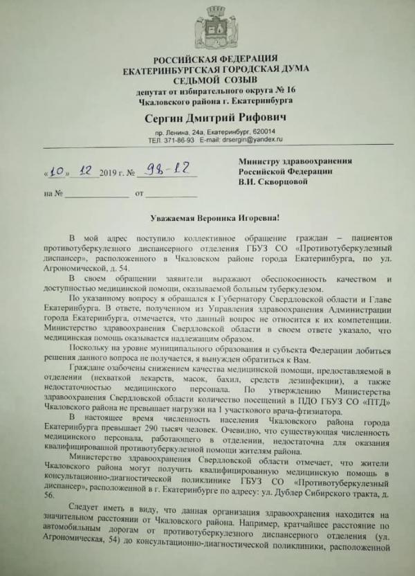 «Прошу вас рассмотреть доводы, содержащиеся в обращении граждан, а также проверить соблюдение органами госвласти Свердловской области установленных федеральным законодательством гарантий оказания больным туберкулезом медицинской помощи, в том числе в части ее доступности», – обратился Сергин к Скворцовой.