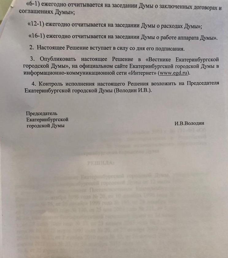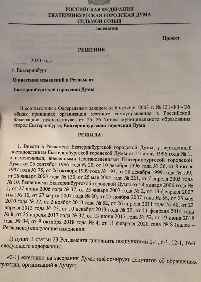Председатель комиссии по городскому хозяйству Александр Колесников выдвинул ответную инициативу – обязать выступать спикера Игоря Володина с ежегодным отчетом о работе перед коллегами. Соответствующие поправки он предлагает внести в регламент думы Екатеринбурга.