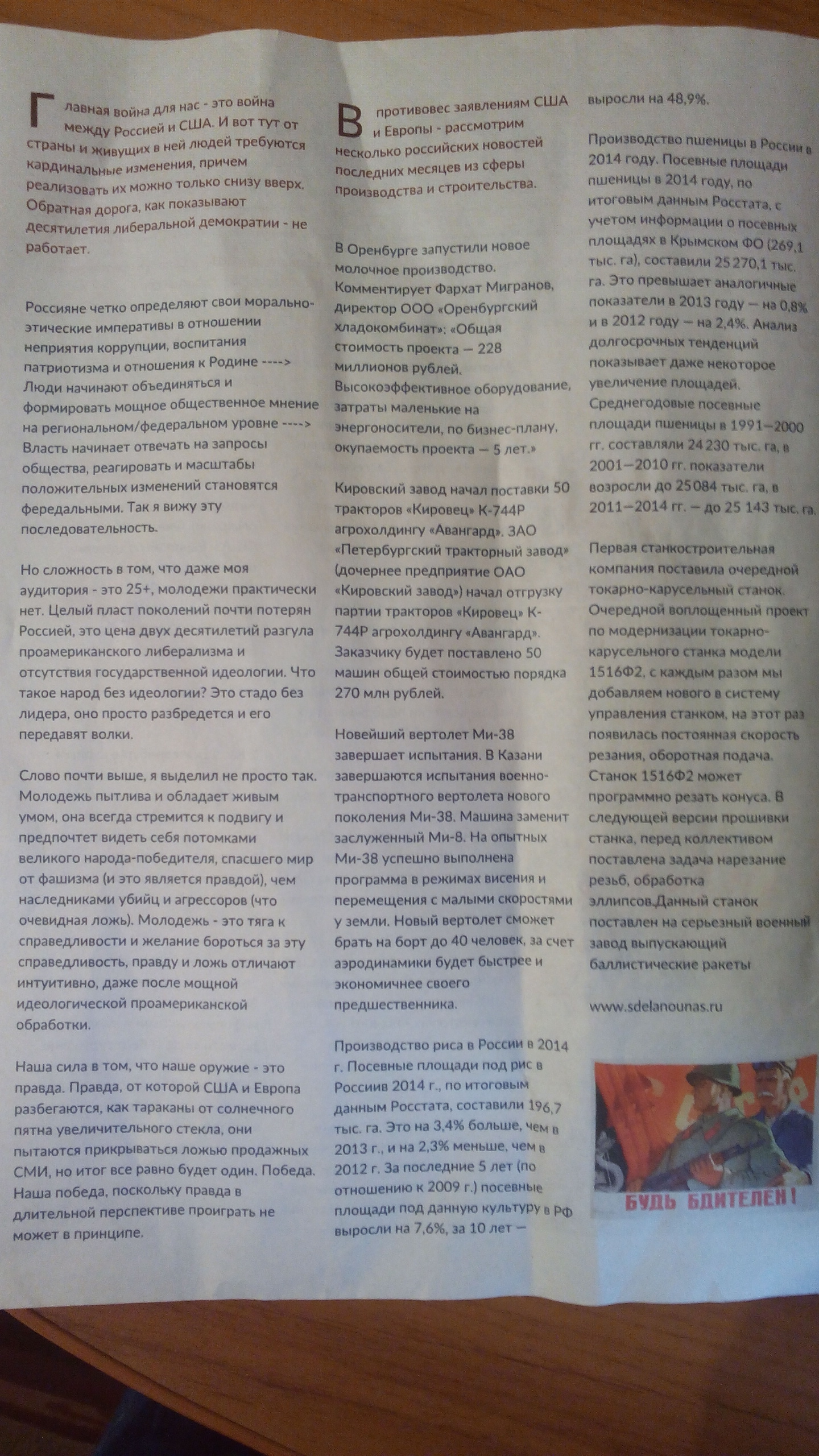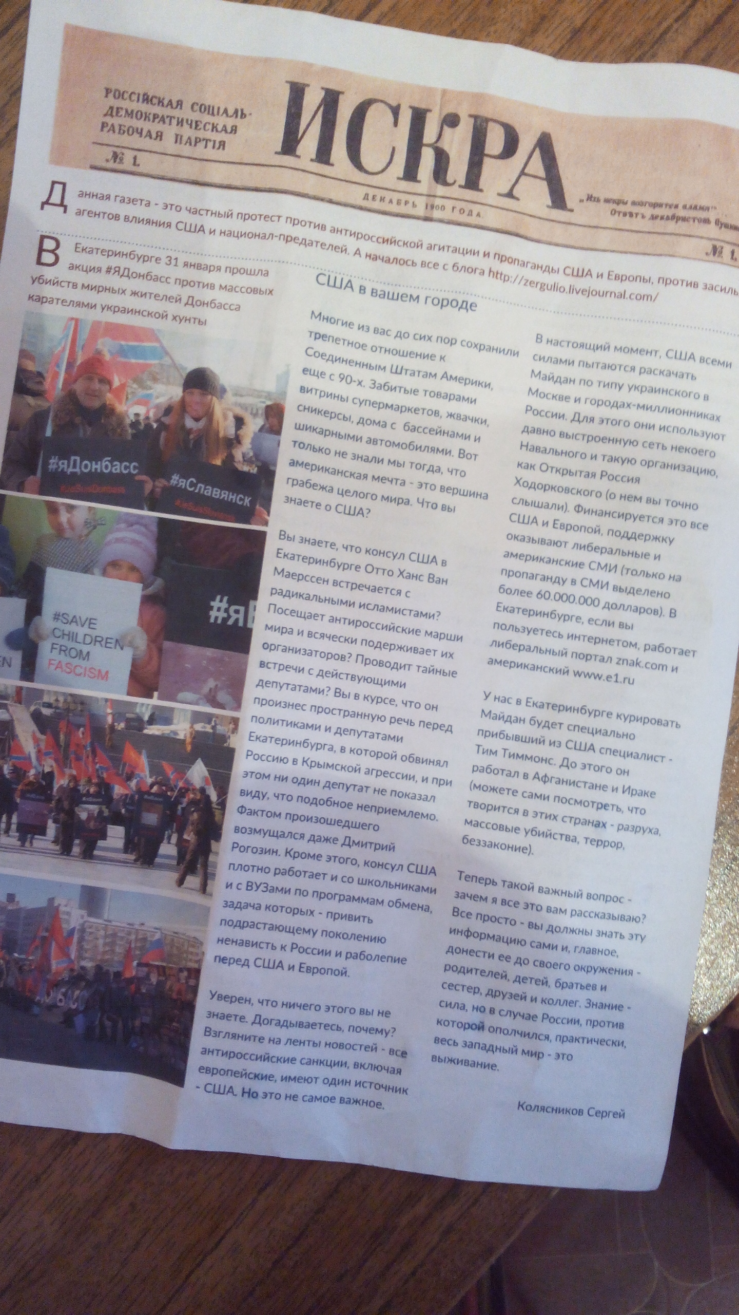На первой полосе — статья гражданского активиста Сергея Колясникова, известного в Екатеринбурге как блогер zergulio, рассказывающая о влиянии Америки на умы людей. На второй странице — краткая информация о российских достижениях в сфере строительства и производства. Создателями екатеринбургской «Искры», вероятно, стали уже упоминаемый выше Сергей Колясников и еще один гражданский активист, автор проекта «Патриоты Урала» Илья Белоус. А вот имена тех, кто вбросил листовки в здание свердловского парламента, остаются загадкой. Если исходить из названия — «Искра», то подозрение тут же падает на партию коммунистов, а если взглянуть на снимки с первой полосы, где есть фото парламентария Евгения Артюха (который, к слову, единственный из депутатов, кто был на «Стопфашингтон-2»), то можно подумать, что листовка появилась при его содействии. Однако официально ни партия КПРФ, ни Евгений Артюх свою причастность к данной газете не подтверждают.