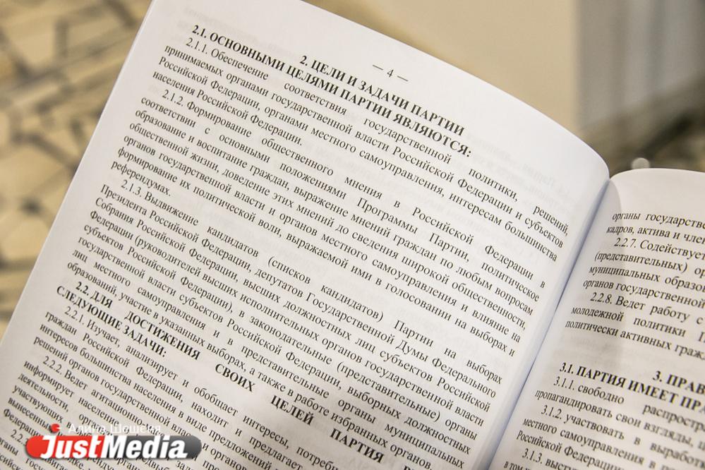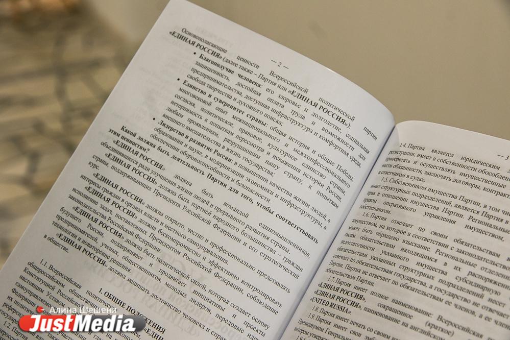 Членам свердловского отделения «Единой России» (ЕР) на сегодняшнем заседании политсовета раздали обновленный Устав партии. В документе, разрабатываемом полгода, появилась преамбула и страница с целями и задачами партии.