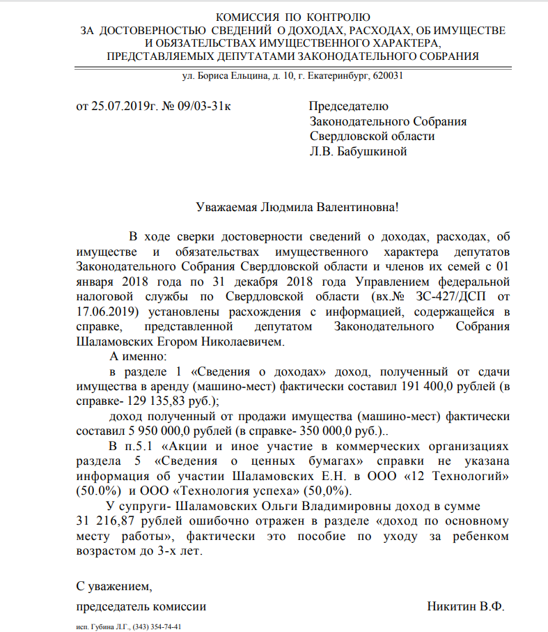 Шаламовских указал, что заработал от сдачи в аренду машино-места 129 135,83 рублей. При этом проверка показала, что он заработал на этом 191 400 рублей. Также он написал, что продал машино-место за 350 000 рублей, хотя на самом деле выручил от этой сделки 5 950 000 рублей. Депутат не указал и то, что ему принадлежит 50% в ООО «12 Технологий» и 50% в ООО «Технология успеха».