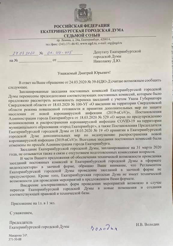 «Регламентом Екатеринбургской городской думы проведение заседаний в заочной форме не предусмотрено. Кроме того, городская дума не имеет технической возможности для проведения мероприятий в предложенном вами формате. Внедрение альтернативных форм проведения мероприятий возможно в случае переезда городской думы в новые помещения и создания соответствующей правовой и технической базы», – говорится в официальном ответе.