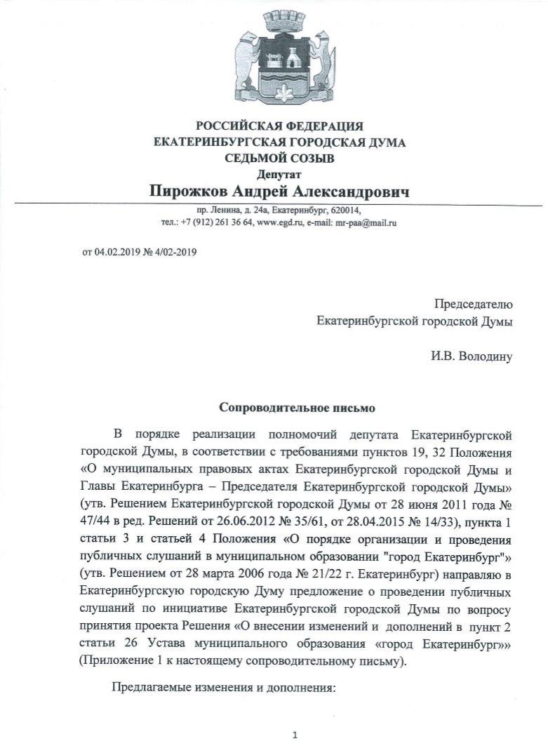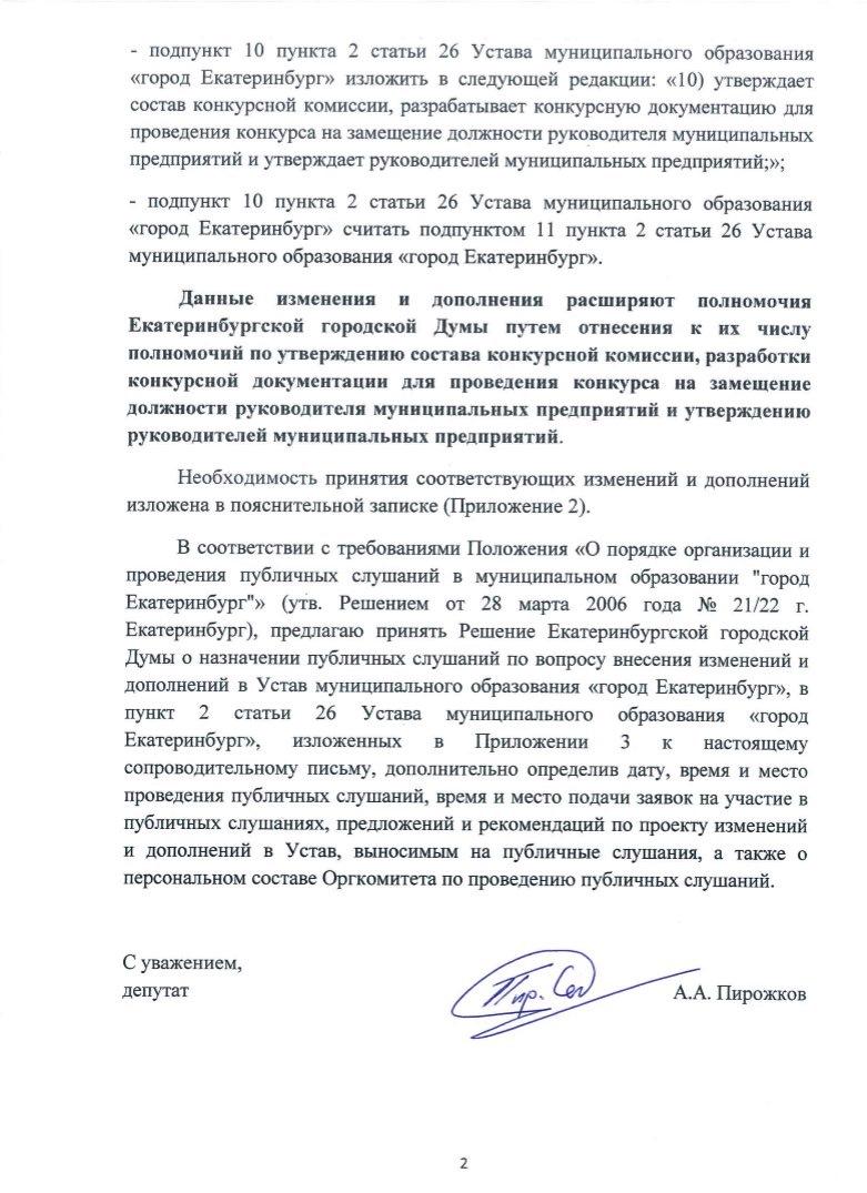 «В целях увеличения прозрачности хозяйственной деятельности муниципальных предприятий нашего города мной было предложено вынести на рассмотрение Екатеринбургской городской думы вопрос внесения изменений в Устав города. Предлагается наделить именно ЕГД полномочиями по контролю за проведением конкурса на замещение должностей руководителей МУПов и непосредственно полномочиями по назначении на должности победителей этого конкурса», – написал на личной странице в соцсетях Пирожков.