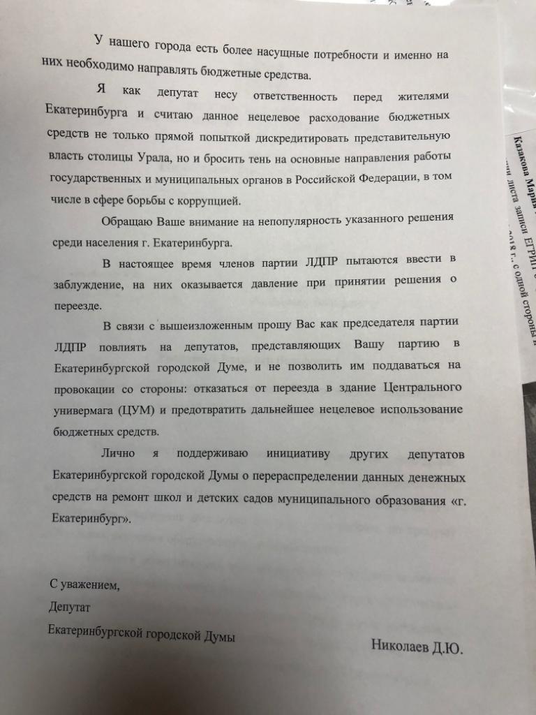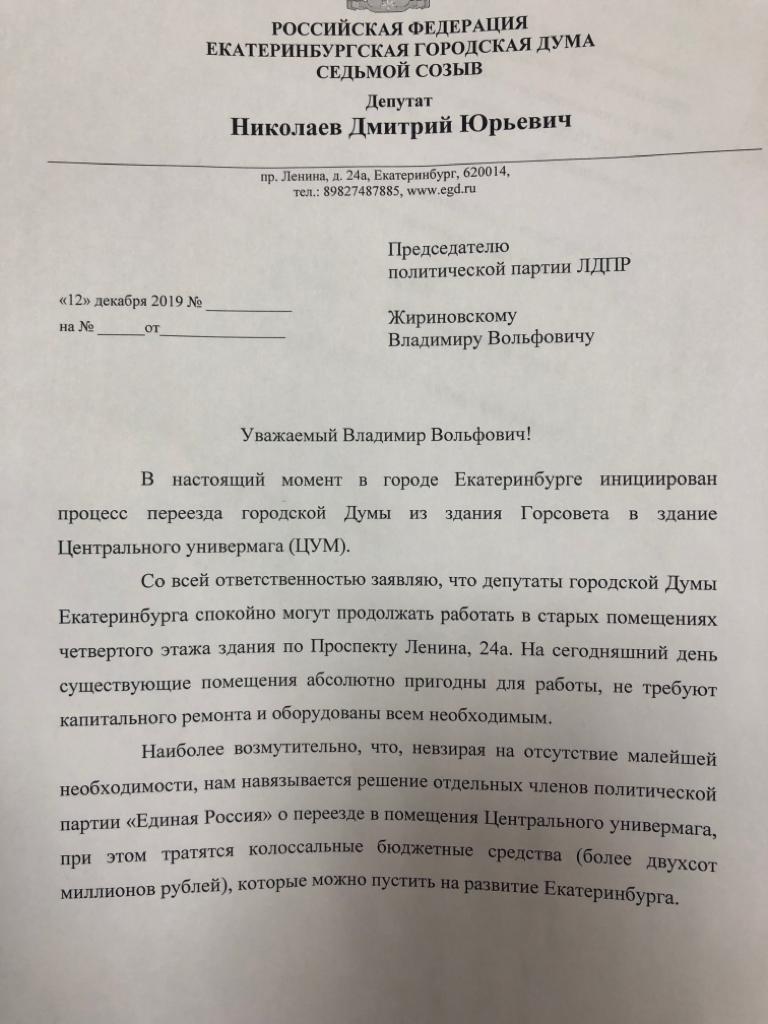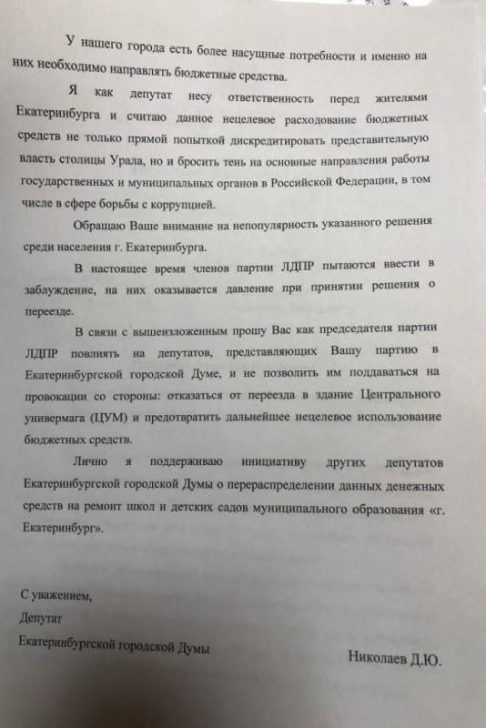«Членов партии ЛДПР пытаются ввести в заблуждение, на них оказывается давление при решении о переезде. В связи с этим прошу Вас как председателя партии ЛДПР повлиять на депутатов, представляющих Вашу партию в Екатеринбургской гордуме, и не позволить им поддаться на провокации со стороны: отказаться от переезда в здание Центрального универмага (ЦУМ) и предотвратить дальнейшее нецелевое использование бюджетных средств», – говорится в письме народного избранника Жириновскому.