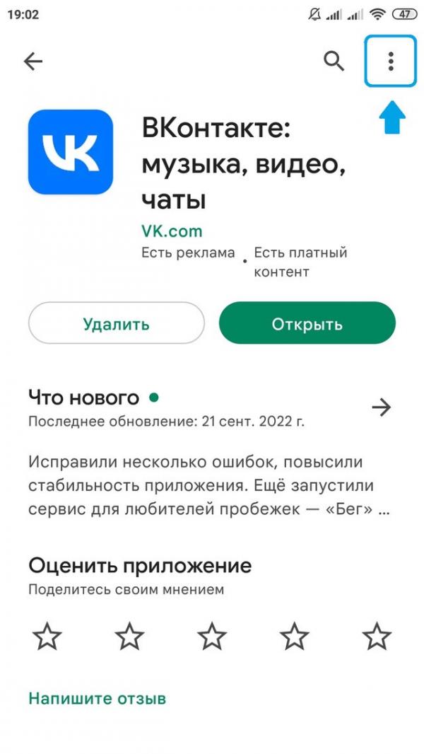 Найти приложение также можно просто через поиск, введя нужное название в строку вверху экрана. Главное — выбрать правильное приложение, а не копию от мошенников. ВК сегодня называется «ВКонтакте: музыка, видео, чаты». Попав на страницу приложения, нужно найти три вертикально расположенные точки в правом верхнем углу экрана. Они расположены правее иконки лупы.