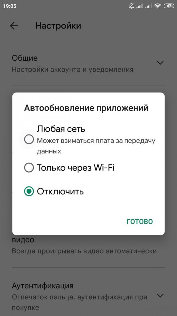 Кстати, если потребуется, можно отключить автообновление всех приложений. Для этого снова нужно нажать на иконку пользователя в поисковой строке, но выбрать не первый раздел, про управление устройством, а пункт «Настройки». Здесь, в «Настройках подключения» будет кнопка «Автообновление приложений». Его можно разрешить, разрешить только с Wi-Fi или отключить.