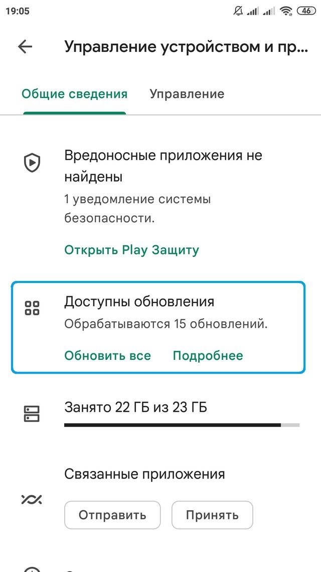 5. Здесь можно нажать кнопку «Обновить всё», и тогда все приложения, к которым выпущены дополнения, будут обновлены. Но можно и просмотреть список приложений, чтобы выбрать для обновления лишь некоторые из них.
