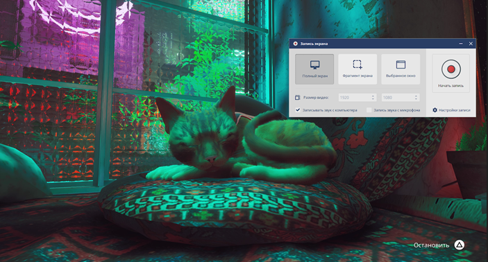 Программа от российских разработчиков. Позволяет записывать экран в трех режимах: полноэкранный, выделенная область или активное окно. Поддерживает запись трансляции с веб-камеры. Можно захватить звук с встроенного или подключенного микрофона, чтобы сопровождать стрим своими комментариями. Для начала съемки достаточно нажать одну кнопку, также есть возможность поставить процесс на паузу.