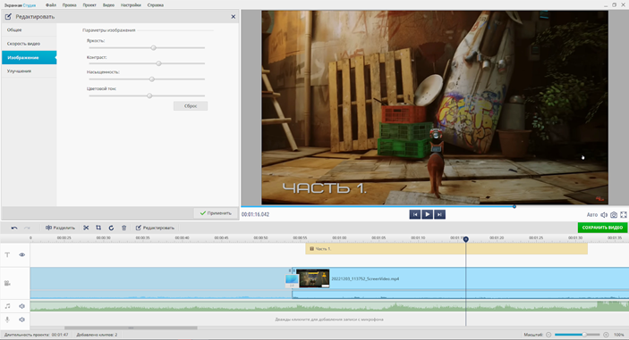 В Экранной Студии есть встроенный видеоредактор, в котором можно открыть и смонтировать записанные ролики. Например, обрезать лишние кадры, выровнять яркость/контрастность,наложить фоновую музыку или свое изображение с вебки поверх основного видеоряда. Готовый результат можно сохранить AVI, MP4, WMV WebM и других распространенных форматах.
