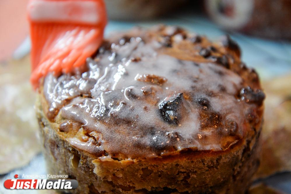 Покрыть пасхальный кекс можно прозрачной матовой помадкой из 200 г сахара, 70 мл воды. Из этих ингредиентов за 6 минут сварить сироп, растереть с 15 мл цитрусового фреша добела, обмазывать сдобу кисточкой.