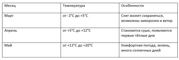 Стоит учитывать, что весной возможны резкие перепады температуры, особенно в марте и апреле. Утром и вечером может быть прохладно, даже если днём тепло.