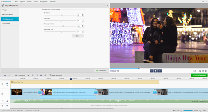 Простой в использовании видеоредактор для монтажа роликов. Набор встроенных инструментов позволит создать клип любой длины или слайд шоу из любимых фото. В приложении ВидеоМОНТАЖ более 100 визуальных эффектов и переходов, коррекция цвета и освещения, стабилизация картинки. На монтажном столе несложно обрезать, склеить или разделить фрагменты видео. Готовый проект можно сохранить более чем в 50 форматах и даже адаптировать под мобильное устройство, социальную сеть или видеохостинг, например Youtube.