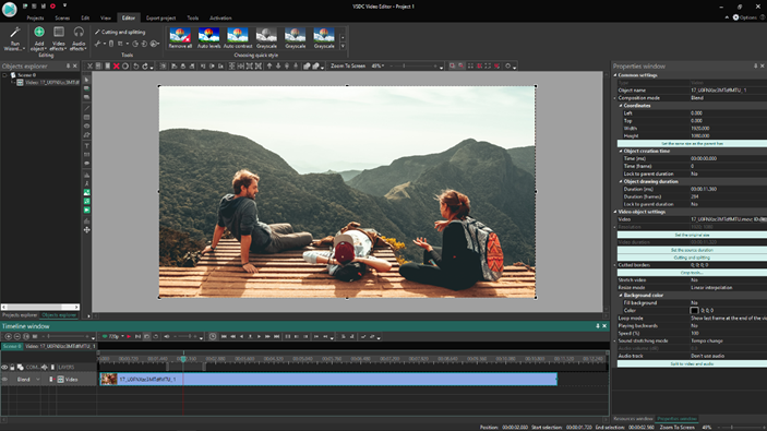 Многофункциональный видеоредактор, который по своим возможностям приближается к профессиональным. Использование полностью бесплатное. Есть набор настроек для продвинутой цветокоррекции ― можно работать с кривыми, фильтрами, гистограммами, H&S и RGB спектром. В VSDC легко удалить зеленый фон (хромакей), наложить разнообразные спецэффекты и переходы. Среди фильтров выделяется DeLogo ― он автоматически маскирует ненужные объекты на видео с помощью размытия или пикселизации. Программа позволяет работать с видео в 4К, VR 360 градусов, в 3D-формате.