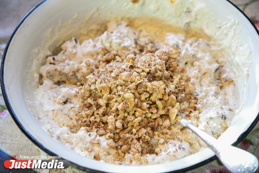 Творог пробить погружным блендером, порциями вмешать мягкое масло и на время оставить в сторону. Сладкую яичную массу развести в сотейнике сливками. Добавить зерна из стручка ванили и тщательно вымешать. Переставить на плиту и при активном помешивании закипятить, проварить минуту до загустения. Пока заварная масса остывает, измельчить орехи, запарить кишмиш, нарезать крупные цукаты. Все смешать и приступить к сборке.