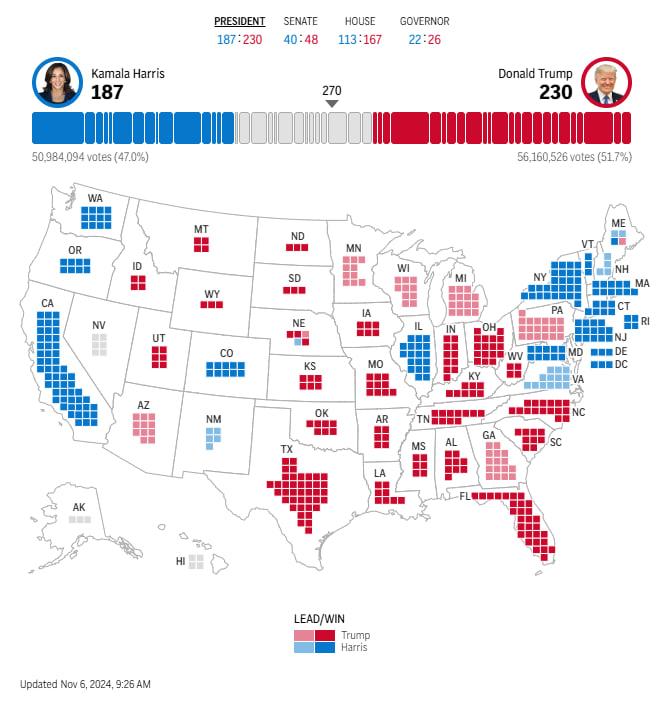 Дональд Трамп лидирует на выборах президента США. На утро среды, 6 ноября. Республиканская партия лидирует не только в битве за кресло президента, но и за места в сенате. Однако расклад могут изменить колеблющиеся штаты, в которых голоса пока не подсчитаны.