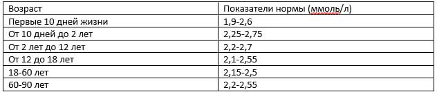 Норма кальция, который измеряется в ммоль/л, зависит от возраста. Значения приведены в таблице:
