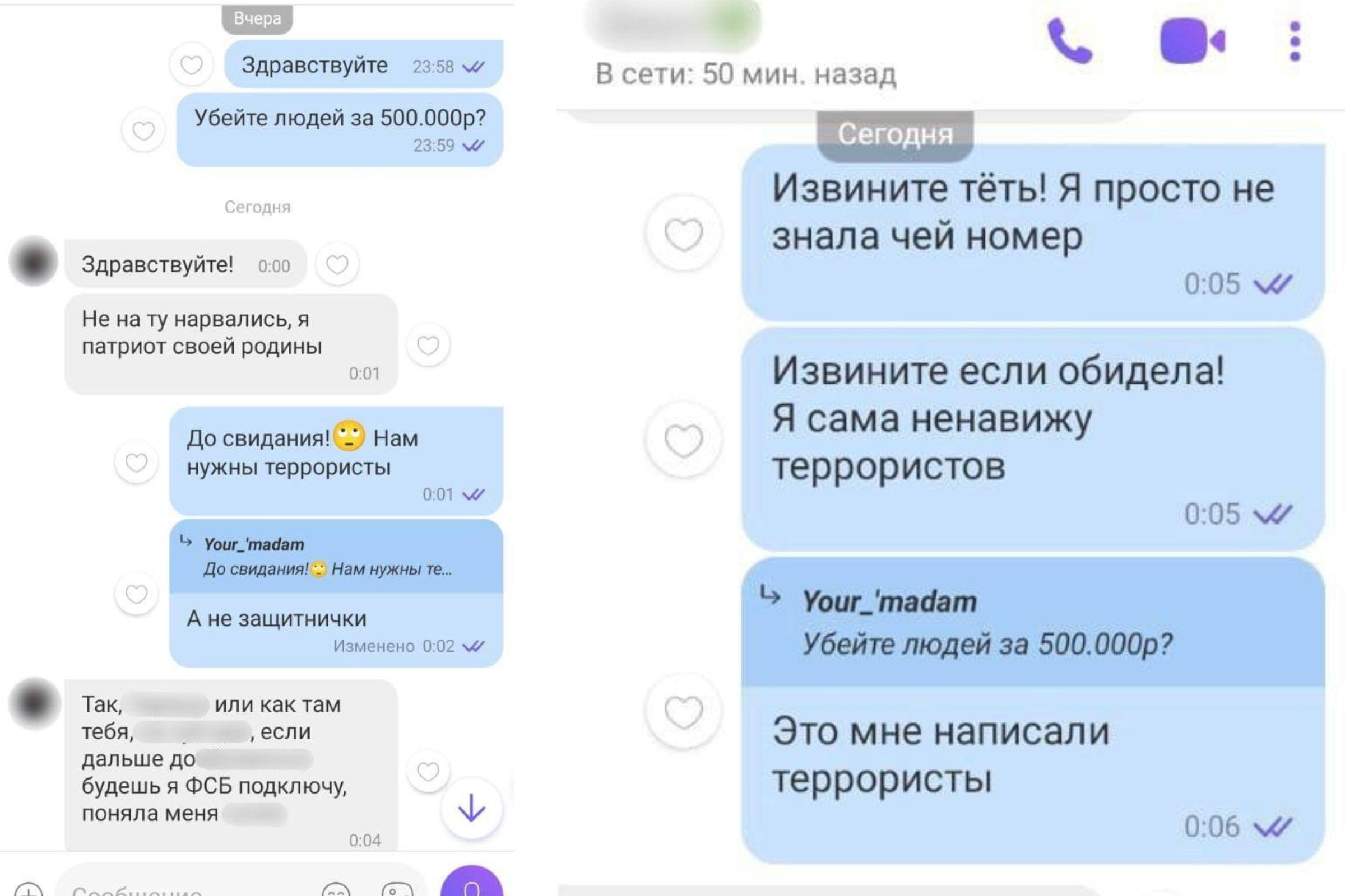 «Извините, теть! Я просто не знала чей номер. Извините, если обидела! Я сама ненавижу террористов. Это мне написали террористы», – писала девочка в свое оправдание.