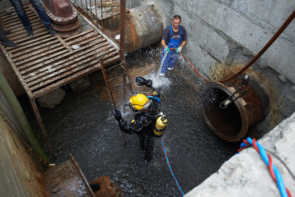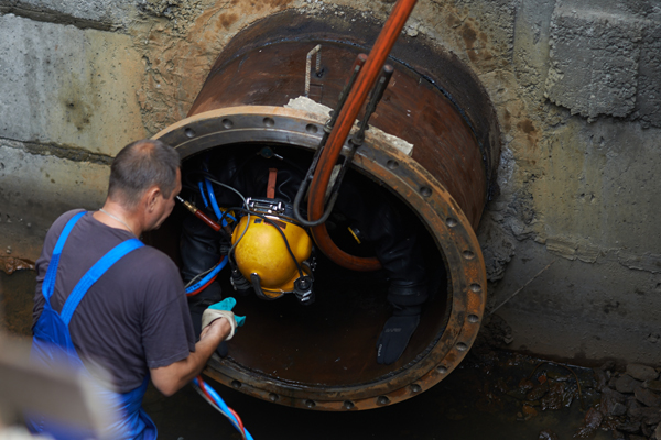 Такое обследование было проведено сегодня в коллекторе, расположенном на улице Гражданской. Водолаз был погружен в наполненный коллектор и провел там около 30 минут, общаясь в это время по рации с контролерами, оставшимися на поверхности. По мере продвижения по коллектору специалист комментировал все, что обнаруживал внутри коллектора и на его стенах, уточняя место расположения и размеры неровностей. В результате обследования было установлено, что поверхность достаточно ровная для проведения процедуры санации, а вероятность незапланированных ситуаций в процессе санирования сведена к минимуму.