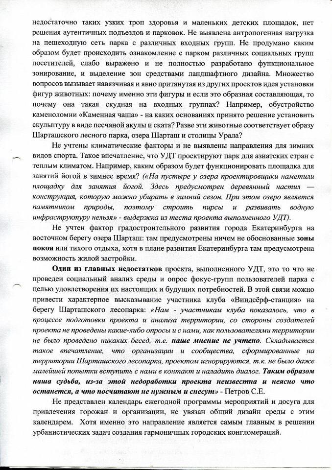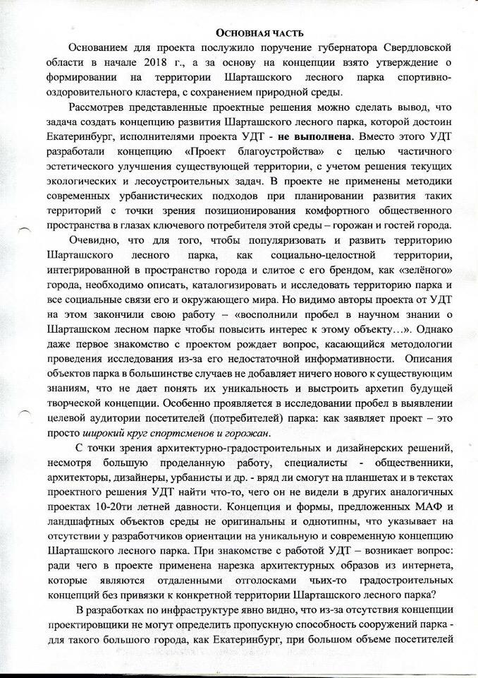 Среди активистов, поднявших этот вопрос, бывший конкурент Артура Зиганшина в борьбе за пост директора Шарташского лесопарка — Александр Умников. Они выложили в группе «За наш Шарташ!» собственное сопроводительное письмо к оценке экспертов. В нем члены инициативной группы перечислили несколько претензий: за год так и не появились ни площадки для обсуждения концепции благоустройства Шарташского лесопарка, ни сама полноценная концепция и др.