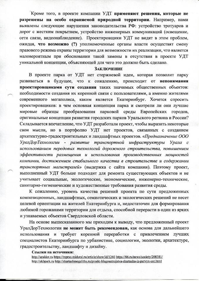 Эксперты сделали в своем заключении один главный вывод — «задача создать концепцию развития Шарташского лесопарка, которой достоин Екатеринбург, исполнителями проекта УДТ — не выполнена». Вместо этого, по их мнению, разработана концепция «Проект благоустройства» для частичного эстетического улучшения существующей территории.