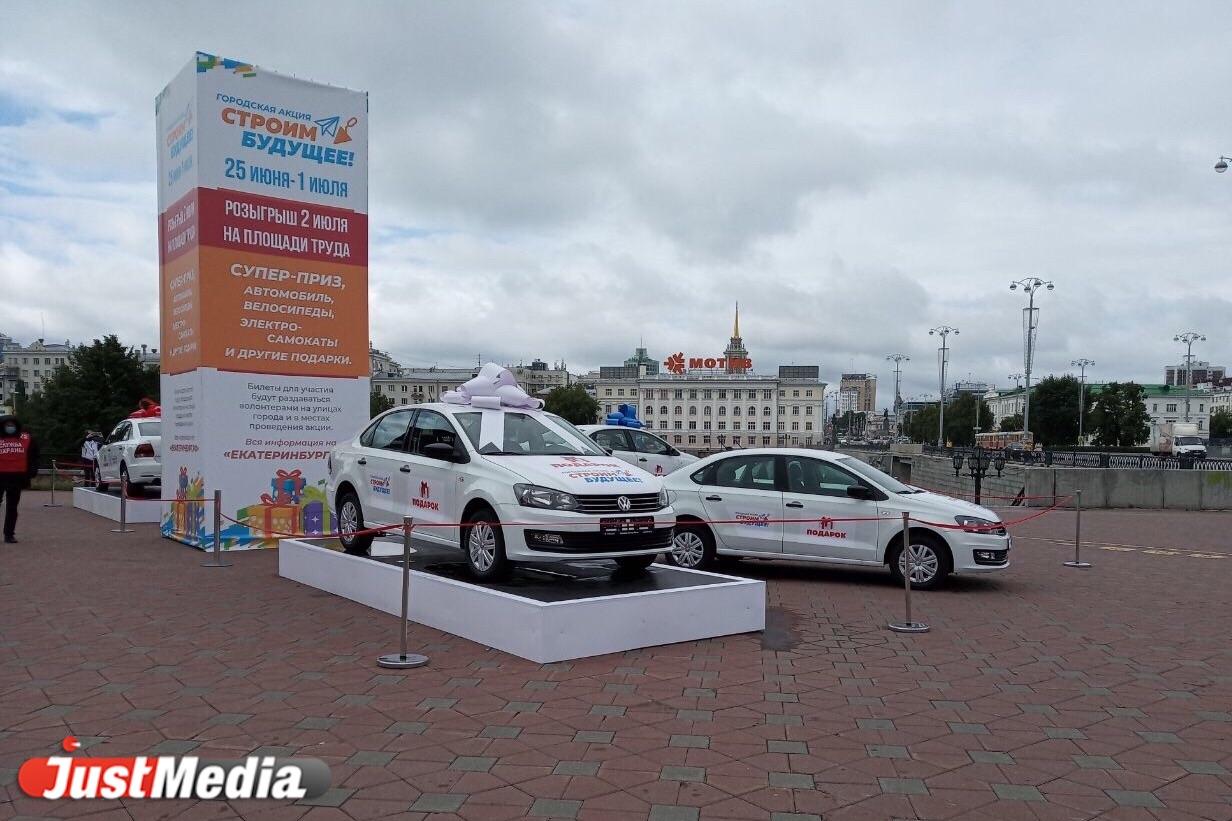 Как пояснил мэр Екатеринбурга Александр Высокинский, выбирать победителей будут 2 июля, после дня голосования около Водонапорной башни на Плотинке. Сейчас на этом месте находятся машины, которые достанутся выигравшим.