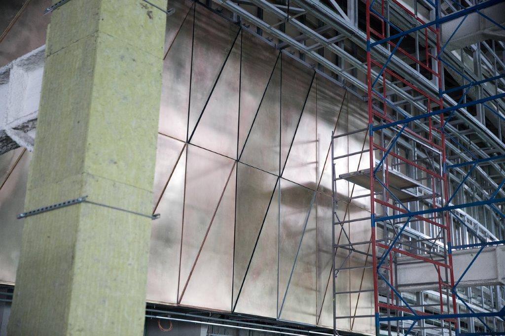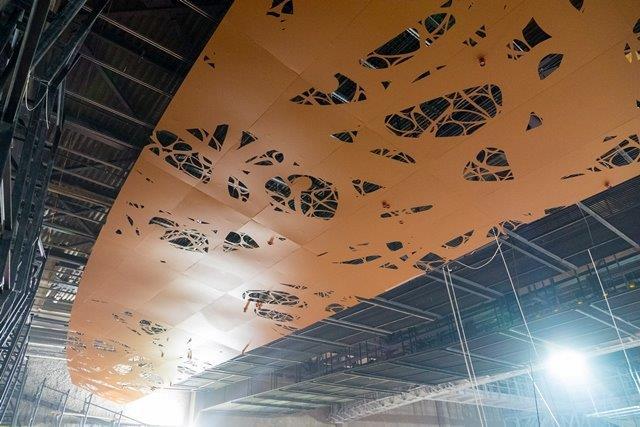 В ходе осмотра объекта ему и членам правительства продемонстрировали возможности подсветки потолка. Система освещения позволяет менять цветовую гамму и режимы света. Эти эффекты могут быть применены для различных форматов мероприятий от конгрессно-выставочных, где будет создаваться деловая атмосфера, до концертов с ярким световым представлением. Параллельно с монтажом потолка ведутся работы по установке акустических панелей, которые выполнены в стиле параметрического дизайна и имитируют рельеф уральских гор. Современная отделка стен создаст не только визуальные акценты в зале, но и позволит обеспечить высокое качество акустики на площадке.
