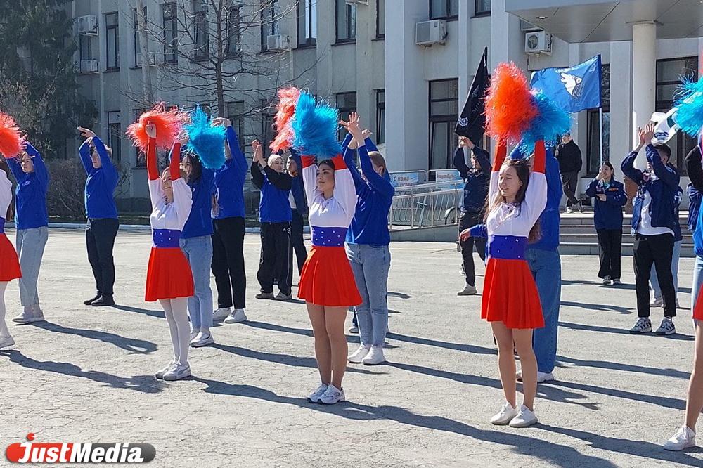 Начался субботник с яркого танцевального флэшмоба от студентов университета. Ребята сплясали под патриотическую музыку в костюмах в цветах российского флага.