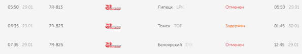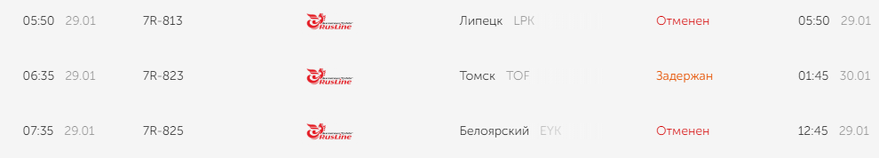 Таким же образом обстоит ситуация с обратными рейсами: полеты из Липецка и Белоярского отменены, а рейс из Томска задерживается на 19 часов. Кроме того, опаздывает и самолет из Казани, который должен был приземлиться в Кольцово еще в 1:15, однако время его прибытия изменили на 11:45. Причины такого сбоя в работе «РусЛайна» не уточняются.