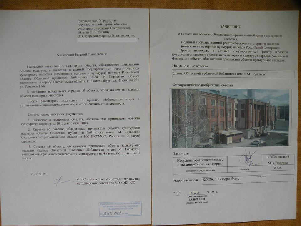 В Управление госохраны объектов культурного наследия Свердловской области эксперты подали заявление о постановке на охрану здания библиотеки имени Максима Горького. Заявление подано от общественного движения «Реальная история». Об этом сообщила архитектор Марина Сахарова.