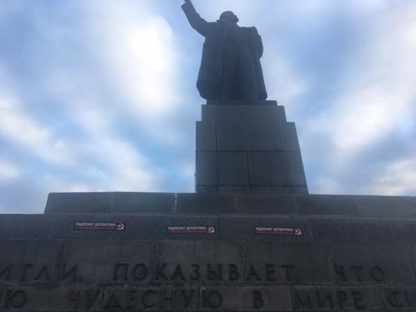 В день рождения Владимира Ленина на его памятнике в центре Екатеринбурга расклеили стикеры с надписью «Подлежит демонтажу в рамках декоммунизации». Акцию подготовило движение «Екатеринбург Консервативный», активно выступающие за снос памятников-наследия Советского Союза.