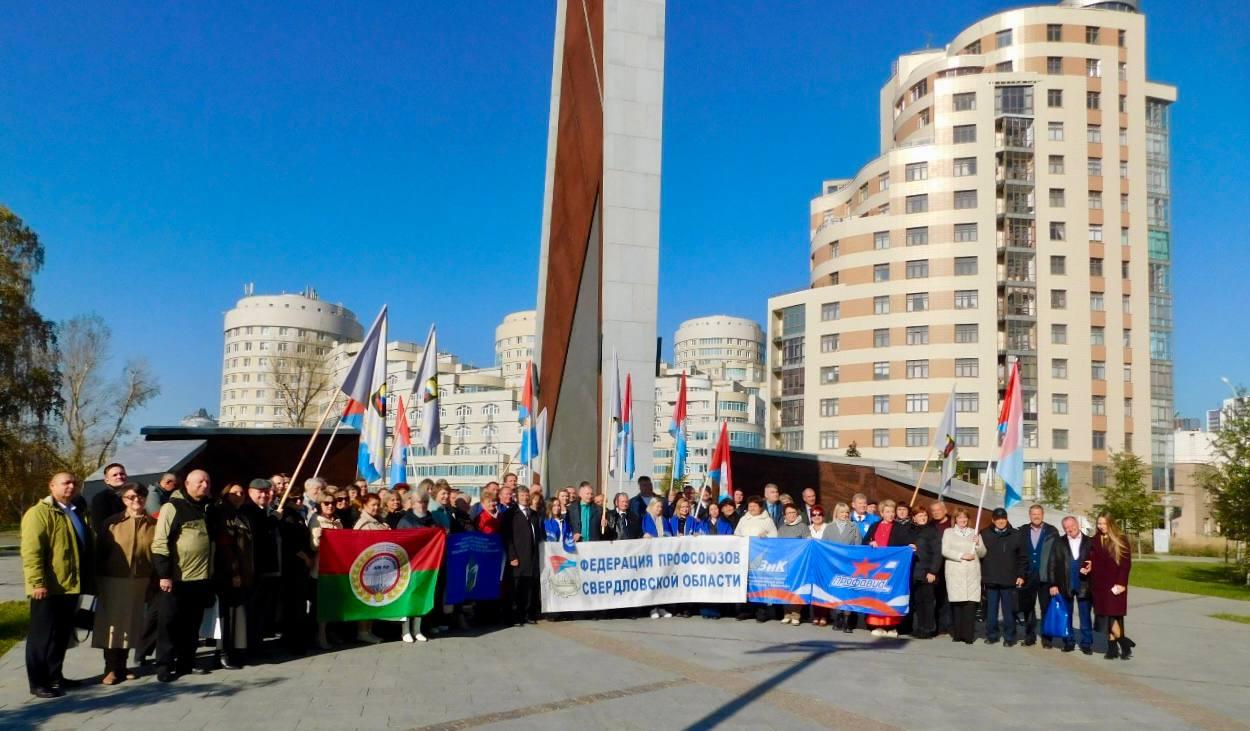 После собрания участники провели мини-митинг «Профсоюзы за достойный труд!» у стелы «Екатеринбург- город трудовой доблести».