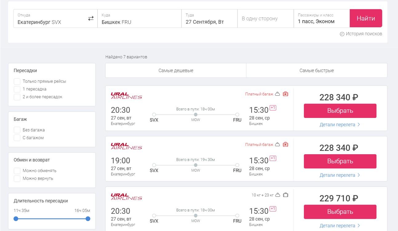 На данный момент авиабилетов в Армению, Грузию, Беларусь, Казахстан, Азербайджан и Узбекистан практически не осталось, а ценник варьируется от 40-80 тысяч рублей до 300-500 тысяч, в зависимости от срочности перелета. Уральские авиалинии предлагают билеты в Бишкек (Киргизия) на сегодня за 230 тысяч рублей. Мест для перелетов в Турцию больше нет.